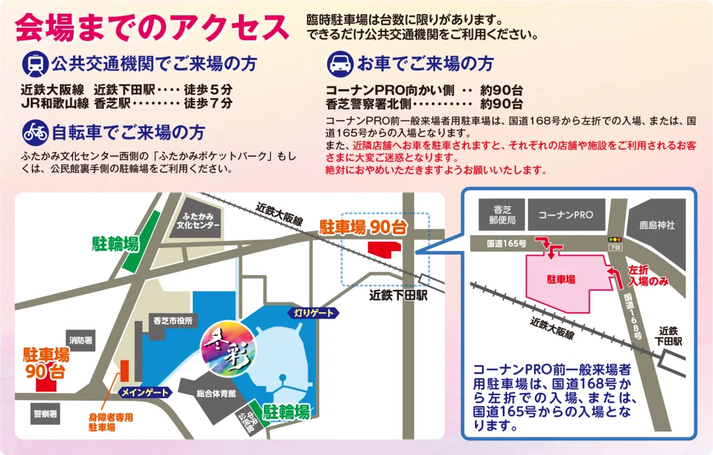 臨時駐車場をご用意しておりますが、できるだけお乗り合わせの上、ご来場ください。コーナンPRO前一般来場者用駐車場は、国道168号から左折での入場、または、国道165号からの入場となります。