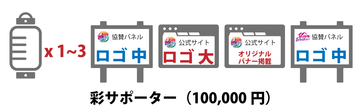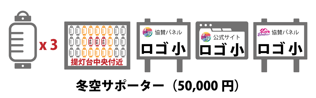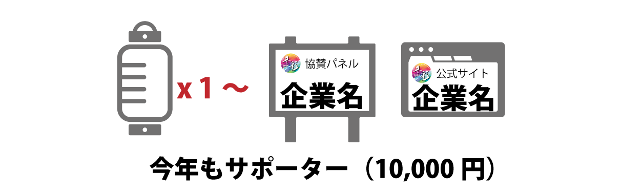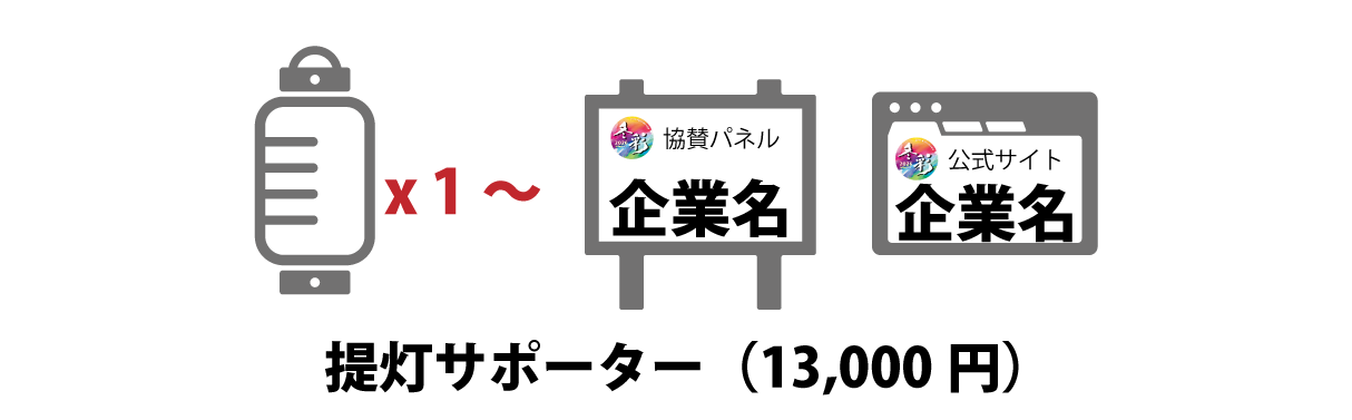 | 提灯サポーター | 13,000円 | 企業名掲載 | 新規 1張 | 企業名掲載 | 複数口可 |